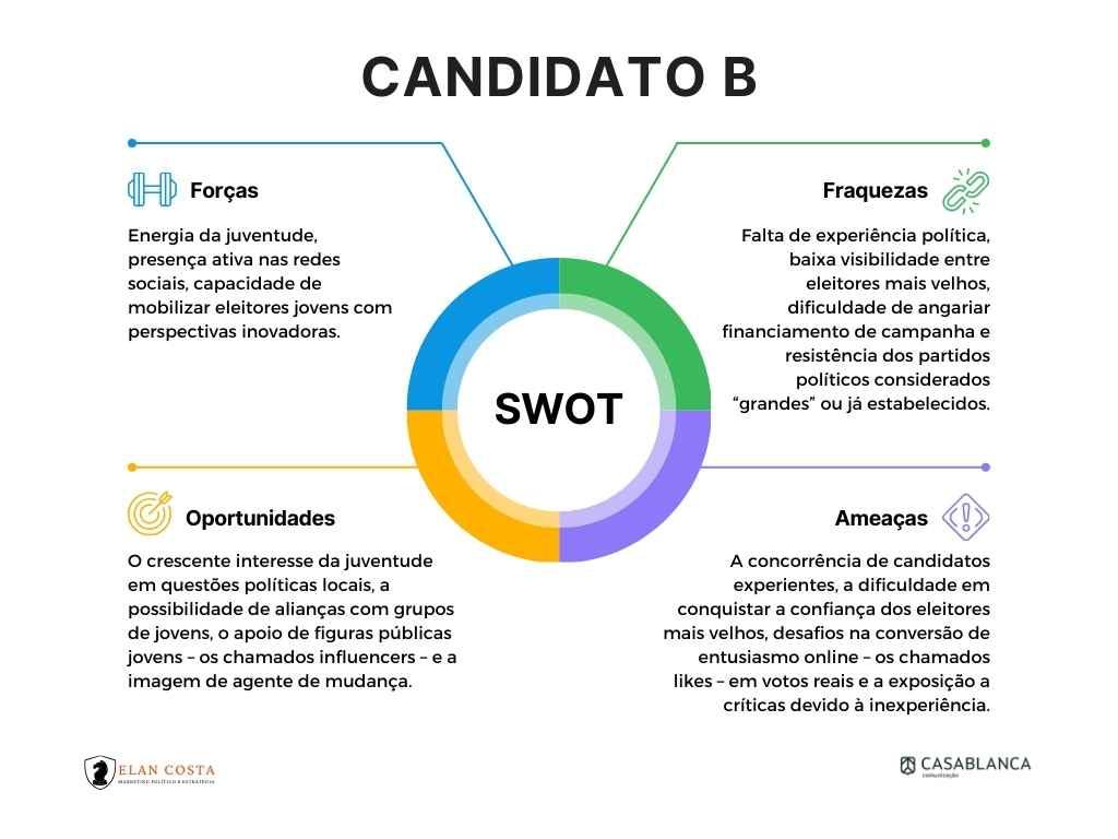 Neste exemplo, o Candidato A traz consigo uma valiosa experiência política anterior, uma vez que já possui um know-how de presidente de bairro ou líder de determinada igreja ou associação. No entanto, enfrenta a limitação de ser pouco conhecido fora desse reduto. Veja na imagem a seguir a análise SWOT exemplo do Candidato A: