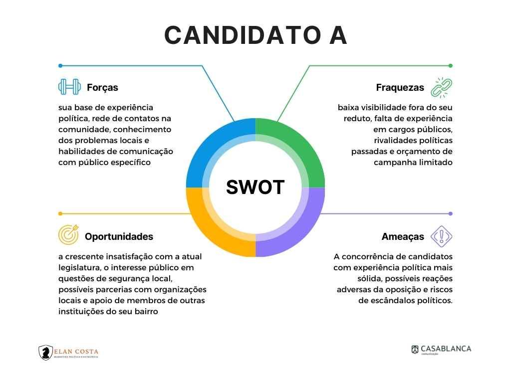 Ambos os exemplos de candidatos ilustram como a análise SWOT pode ser uma ferramenta aliada na construção de estratégias para alcançar cada vez mais sucessos nas ações de campanha. Independentemente das características individuais, a execução eficaz das estratégias ao longo do processo e o envolvimento ativo com a região são fundamentais para conquistar a confiança dos eleitores e alcançar os objetivos.