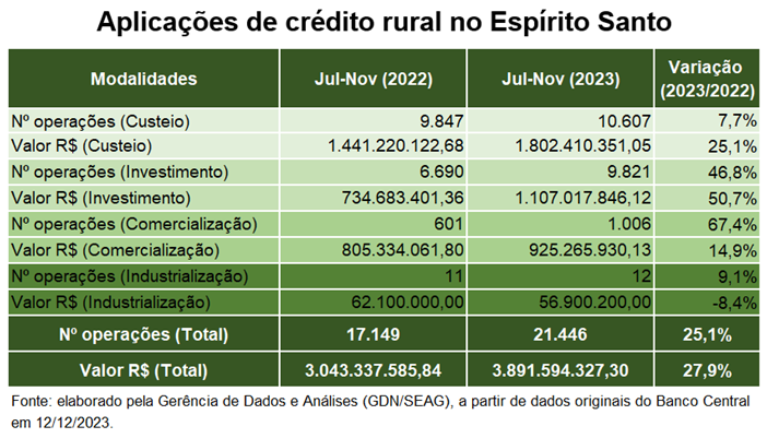 Em cinco meses, foram aplicados cerca de R$ 3,9 bilhões de crédito rural no Espírito Santo, um crescimento de 28% em relação ao montante de R$ 3,04 bi aplicados de julho a novembro de 2022. O número de operações realizadas para as diversas atividades agrícolas capixabas também subiu de 17.149 para 21.446, num aumento de 25%. Os dados foram apurados pela Gerência de Dados e Análises da Secretaria da Agricultura, Abastecimento, Aquicultura e Pesca (Seag), a partir de informações do Banco Central.